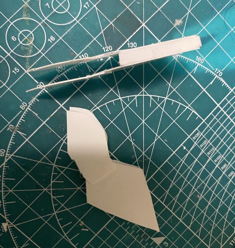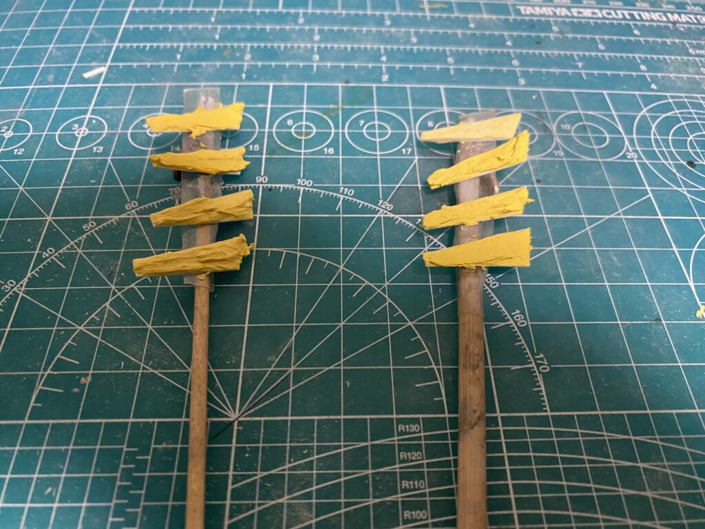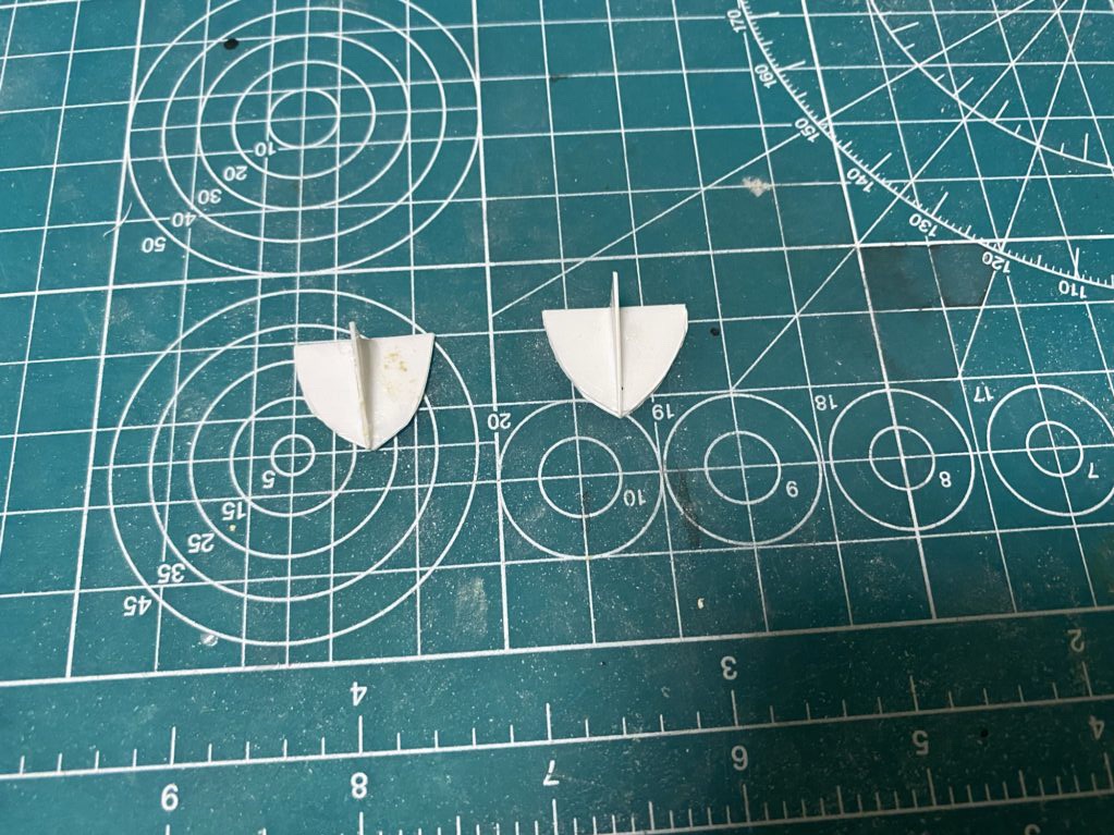 接続部につく小さな羽を計8枚つくります。これもプラ板にポリパテを塗ります。
