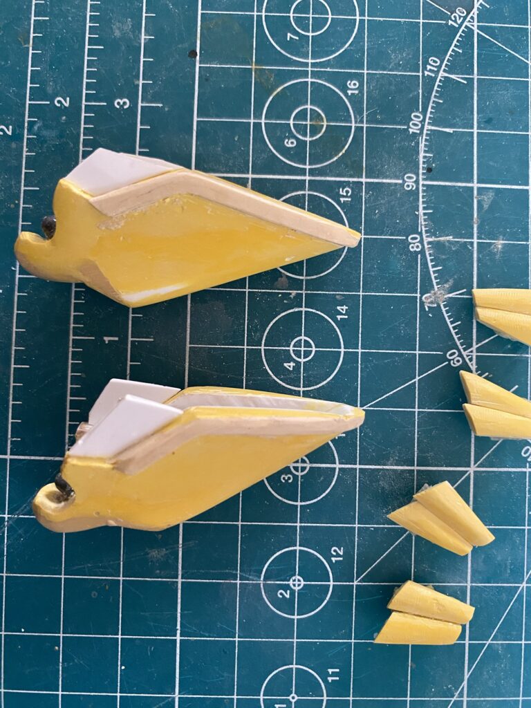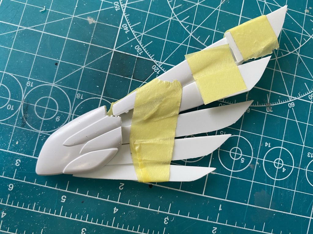 羽の接続部はそのまま使おうと思いましたが、整形するのも面倒なので、作ることにしました。まずプラ板で適当に形をつくり、ポリパテを塗っては削り整形していきます。