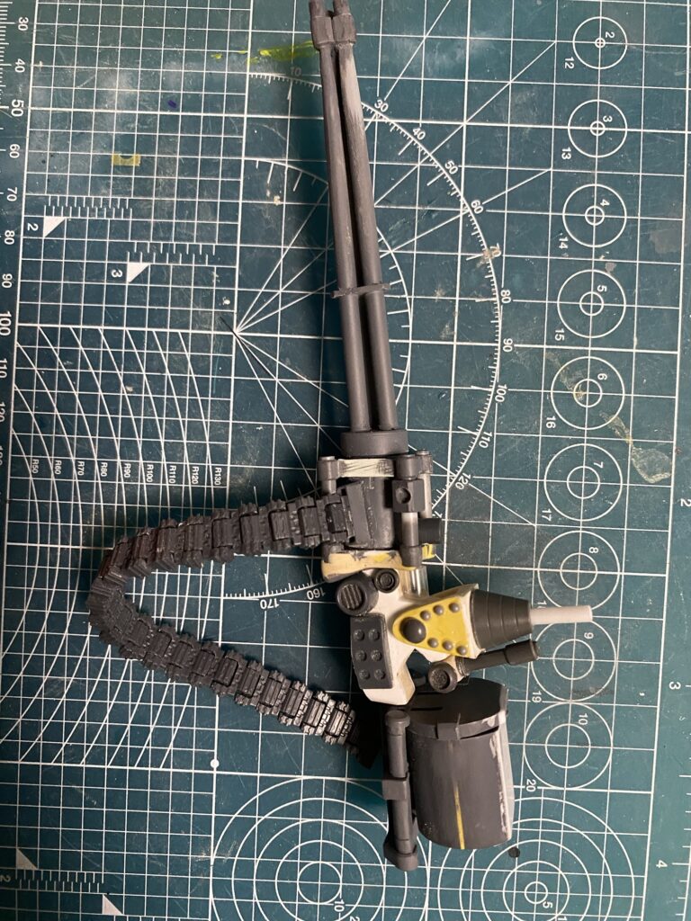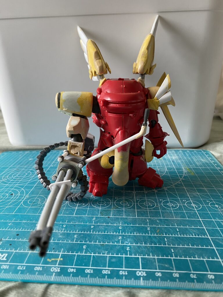 制作に集中しすぎて写真があまりないのですが、とりあえずざっくりとこんな感じです。中央の腰アーマー?の延長、左肩アーマー部を作成、翼と本体の接続部作成、右腕部はほぼ新造です。ここまでで3週間くらいかかりました。